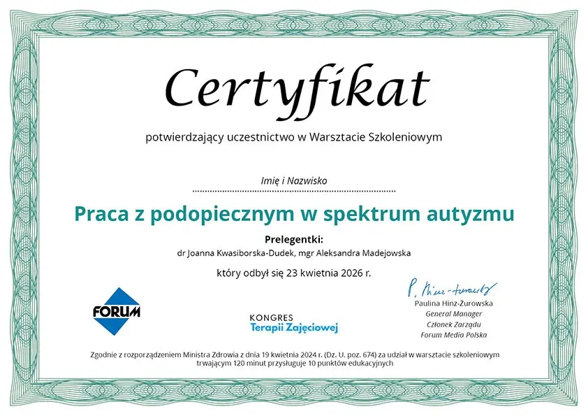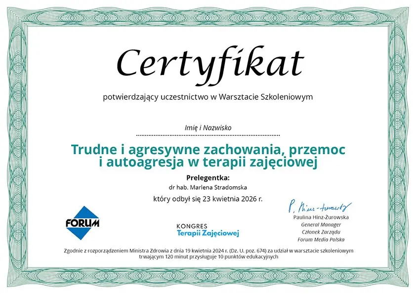 - Udział w warsztacie II: Trudne i agresywne zachowania, przemoc i autoagresja w terapii zajęciowej